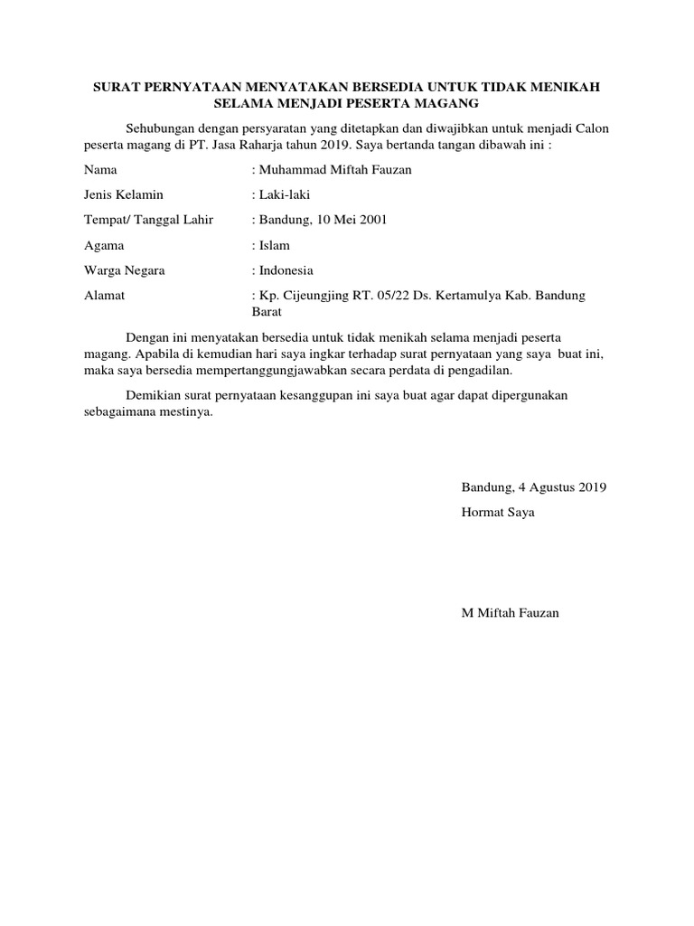 5 Contoh Surat Pernyataan Kesanggupan Yang Berlaku Di Indonesia Rumah Com from cdn-cms.pgimgs.com Menyatakan untuk tidak akan menikah selama menjadi peserta magang di pt angkasa raya. Surat pernyataan seperti di bawah ini : Helko werk germany vario : Surat pernyataan belum menikah dan sanggup tidak menikah selama mengabdi saya yang bertanda tangan di bawah ini: Contoh surat pernyataan untuk tidak menikah selama magang from i0.wp.com lukito adi tempat, tanggal lahir : Untuk contoh surat pernyataan tidak menikah selama menjadi peserta magang, maka yang bersangkutan adalah karyawan atau orang yang menjadi peserta magang tersebut. Contoh surat pernyataan tidak akan menikah selama 1 tahun untuk melamar kerja_ setiap instansi atau lembaga mempunyai syarat tertentu dalam merekrut karyawan baru salah satunya meminta kepada calon karyawan atau yang hendak mendaftar untuk menjadi karyawan untuk melampirkan surat pernyatan tidak akan menikah selama satu tahun jika diterima bekerja di instansi atau lembaga tersebut. Dengan surat tertulis ini, saya yang memiliki identitas di bawah ini menyatakan bahwa saya siap sedia ditempatkan di seluruh cabang pt manekin indonesia dan tidak akan meminta mutasi sebelum bekerja selama 3 tahun.